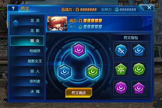 符文有多种类型,不同的角色可增加不同的特殊效果及战力神力。符文品质越高加成效果越高。符文可熔炼为碎片,碎片可用于符文商店兑换完整符文。每个角色均可镶嵌3个符文,每种符文最多可镶嵌1个(即不可重复)。